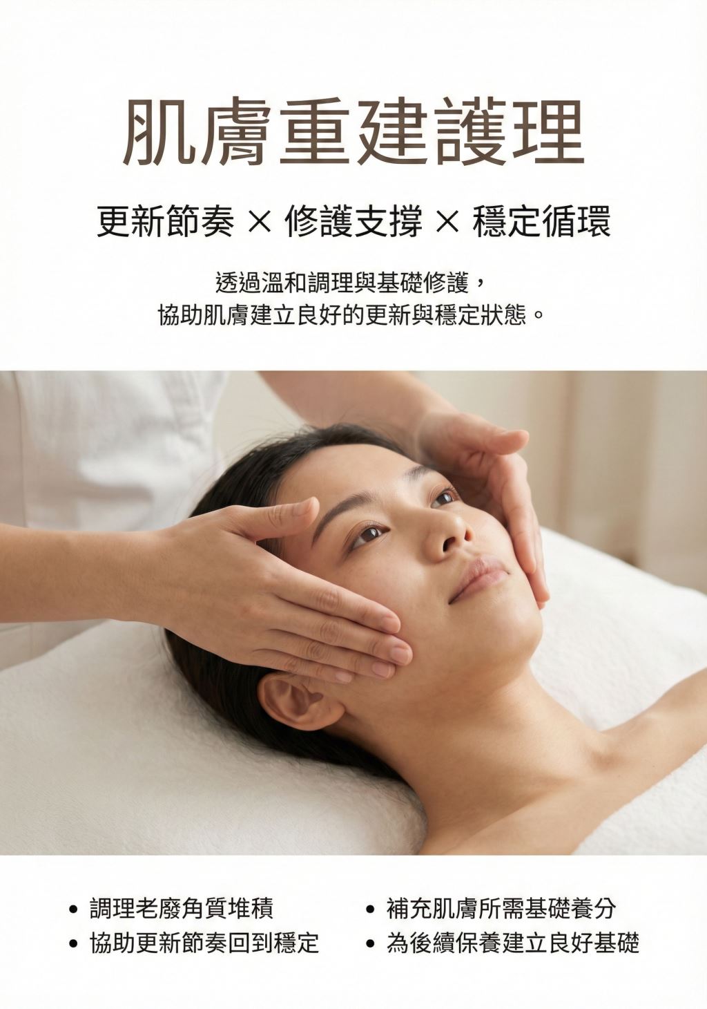 肌膚重建護理以「更新節奏 × 修護支撐 × 穩定循環」為核心概念,透過溫和的調理流程,協助老廢角質代謝順暢,並在更新後補充肌膚所需的基礎養分,讓膚況逐步回到較穩定、健康的狀態。