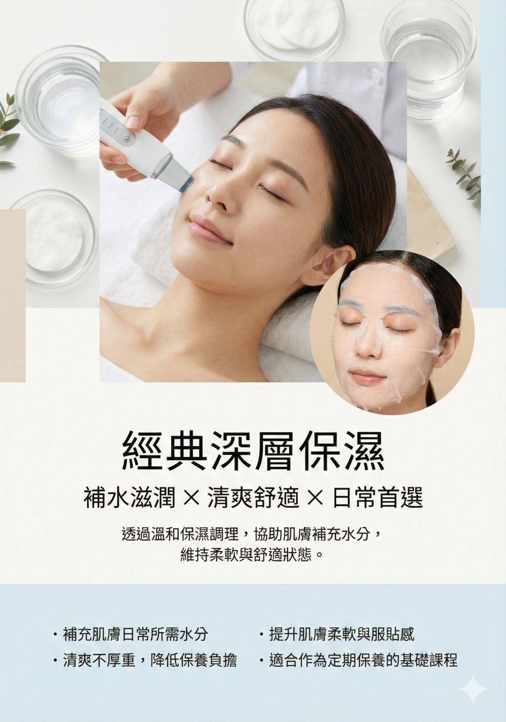當肌膚長期處於缺水狀態時,容易出現乾燥、緊繃、上妝不服貼,甚至讓後續保養難以發揮應有的感受。補水不只是表面的滋潤,而是讓肌膚維持在舒適、穩定的含水狀態。經典深層保濕以「補水 × 鎖水 × 舒適感」為核心,透過溫和的導入與保濕調理,協助肌膚補充所需水分,減少乾燥帶來的不適。整體流程清爽、不厚重,適合各種膚況作為日常保養的入門選擇。課程設計著重於無負擔的保濕體驗,讓肌膚在放鬆的狀態下回到柔軟、透亮且好上妝的狀態。