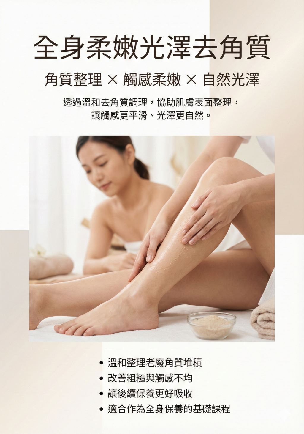 全身柔嫩光澤去角質以溫和方式進行全身角質整理,協助帶走多餘堆積,讓肌膚表面回到較平滑、乾淨的狀態。搭配後續潤澤調理,使肌膚觸感更柔軟,視覺上呈現自然光澤感。