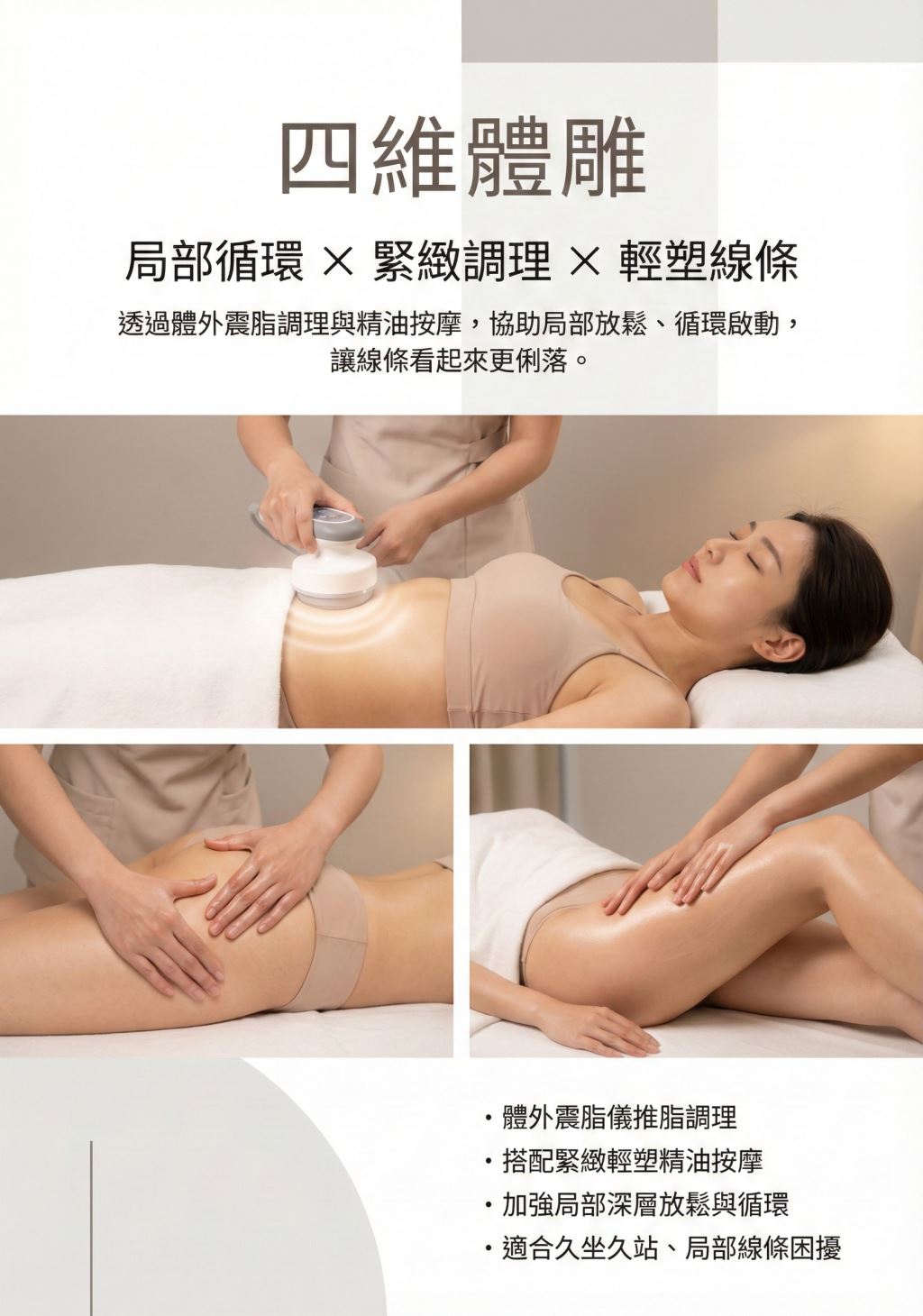 四維體雕以「放鬆 × 循環 × 緊緻調理」為核心,透過體外震脂調理搭配緊緻輕塑精油按摩,協助局部肌群放鬆,讓循環回到較順的狀態。課程設計著重在溫和調理與身體感受的改善,並非追求快速改變,而是建立較穩定、舒適的身體線條節奏。