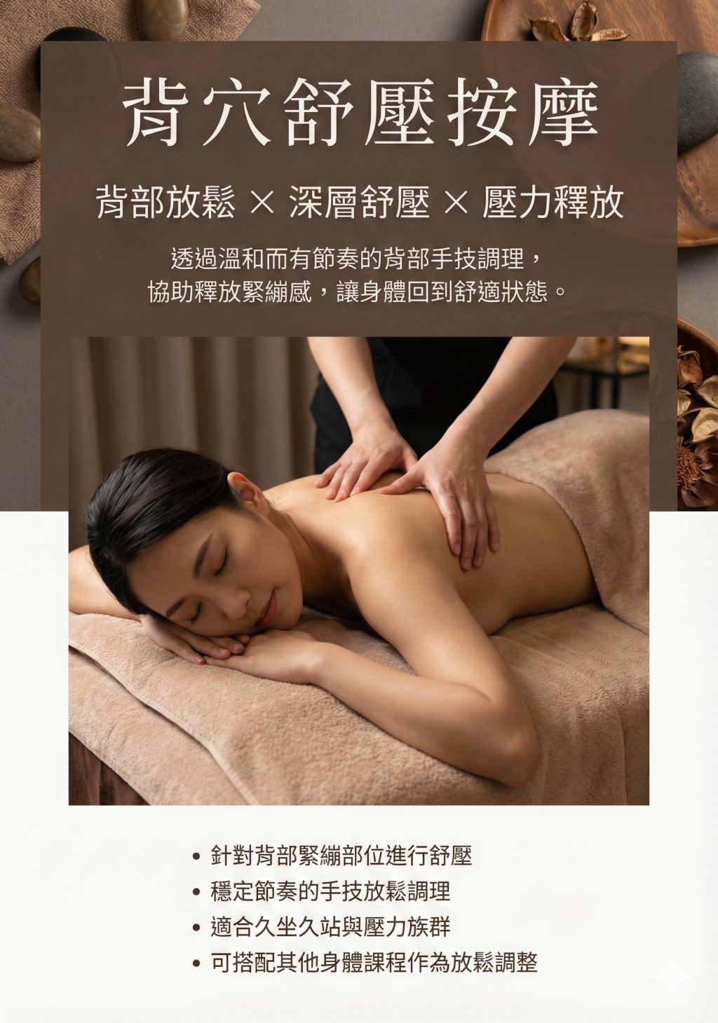 長時間久坐、低頭工作或壓力累積,容易讓背部肌群持續緊繃,進而影響整體放鬆感受。即使休息,也常覺得背部沉重、不易真正放鬆。背穴舒壓按摩以背部為核心,透過溫和而有節奏的按壓與推揉手法,針對常感緊繃的部位進行放鬆調理,讓身體逐步回到較舒適、輕鬆的狀態。課程過程不刺激,節奏穩定,適合需要紓解壓力、放慢身體節奏的人。本課程可單獨作為日常舒壓選擇,也適合搭配溫熱或體雕類課程,作為前後放鬆與調整。