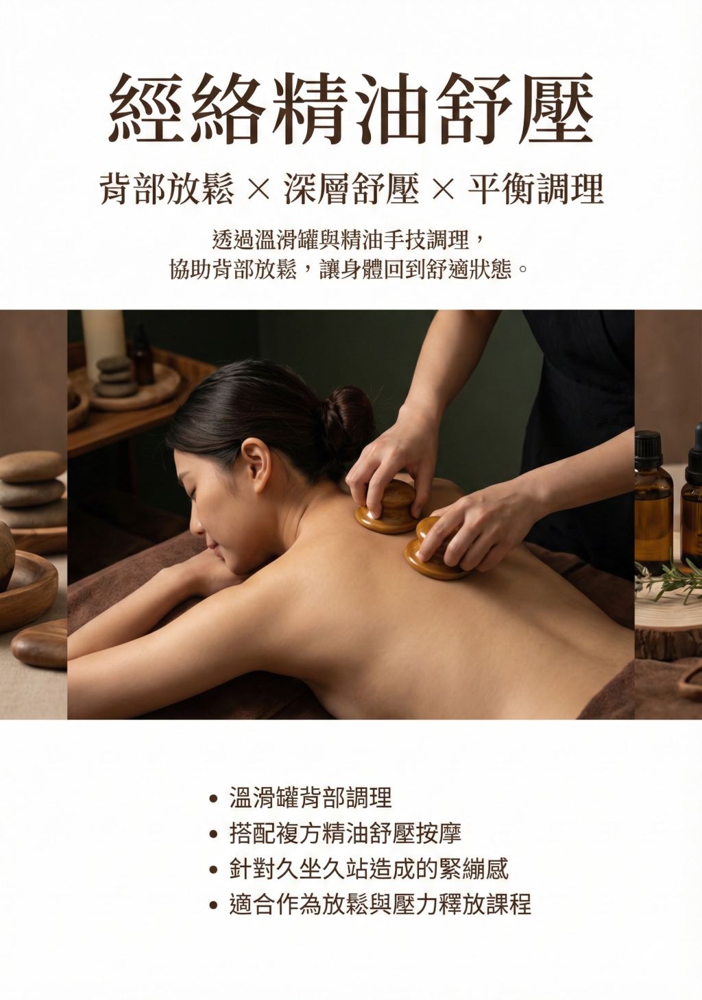 長時間久坐、姿勢不良或壓力累積,容易讓背部與肩頸感到緊繃、沉重,進而影響整體放鬆感受。即使沒有明顯不適,身體仍可能長期處於緊張狀態。經絡精油舒壓透過溫滑罐調理與手技按摩,針對背部緊繃部位進行放鬆,引導身體回到較平衡、舒適的狀態。搭配複方精油依循經絡走向進行舒壓調理,讓壓力逐步釋放,身體感受更輕鬆。課程設計著重於「放鬆 × 舒壓 × 流動感」,適合壓力大、久坐久站族群,或作為其他體雕、溫熱課程前後的放鬆搭配。